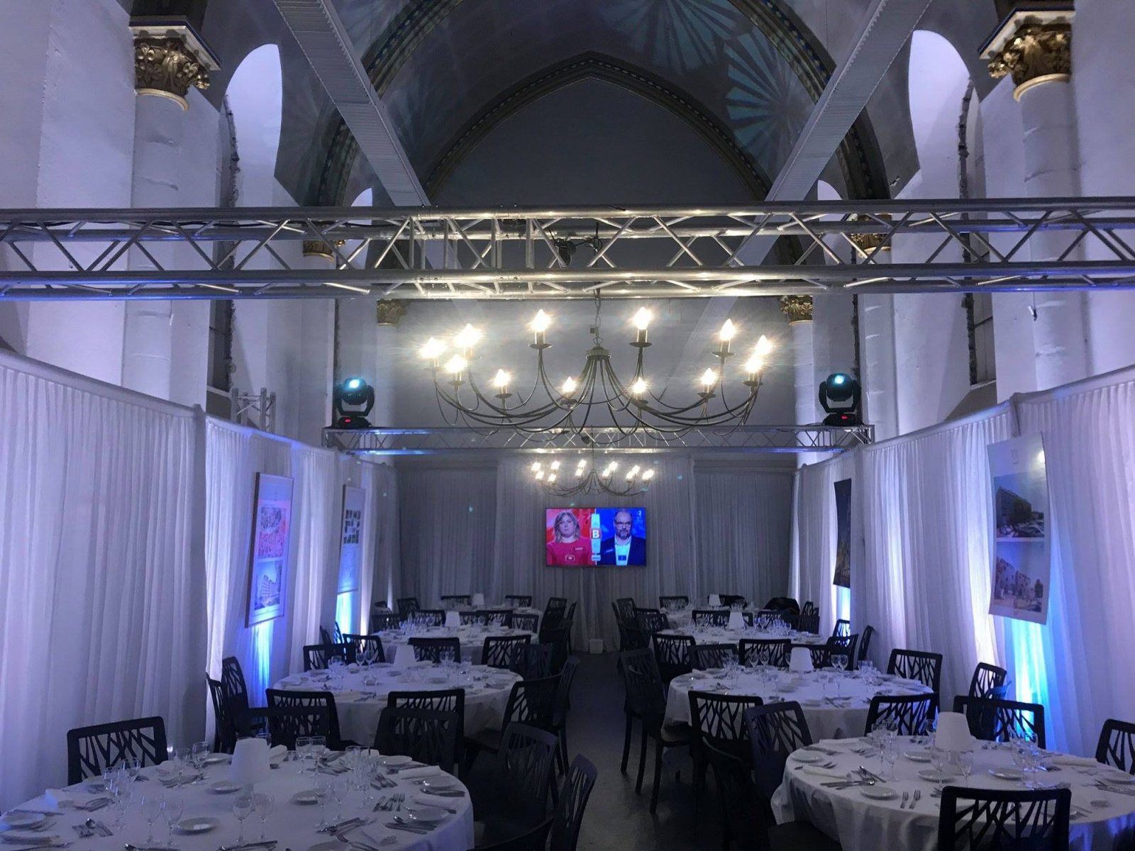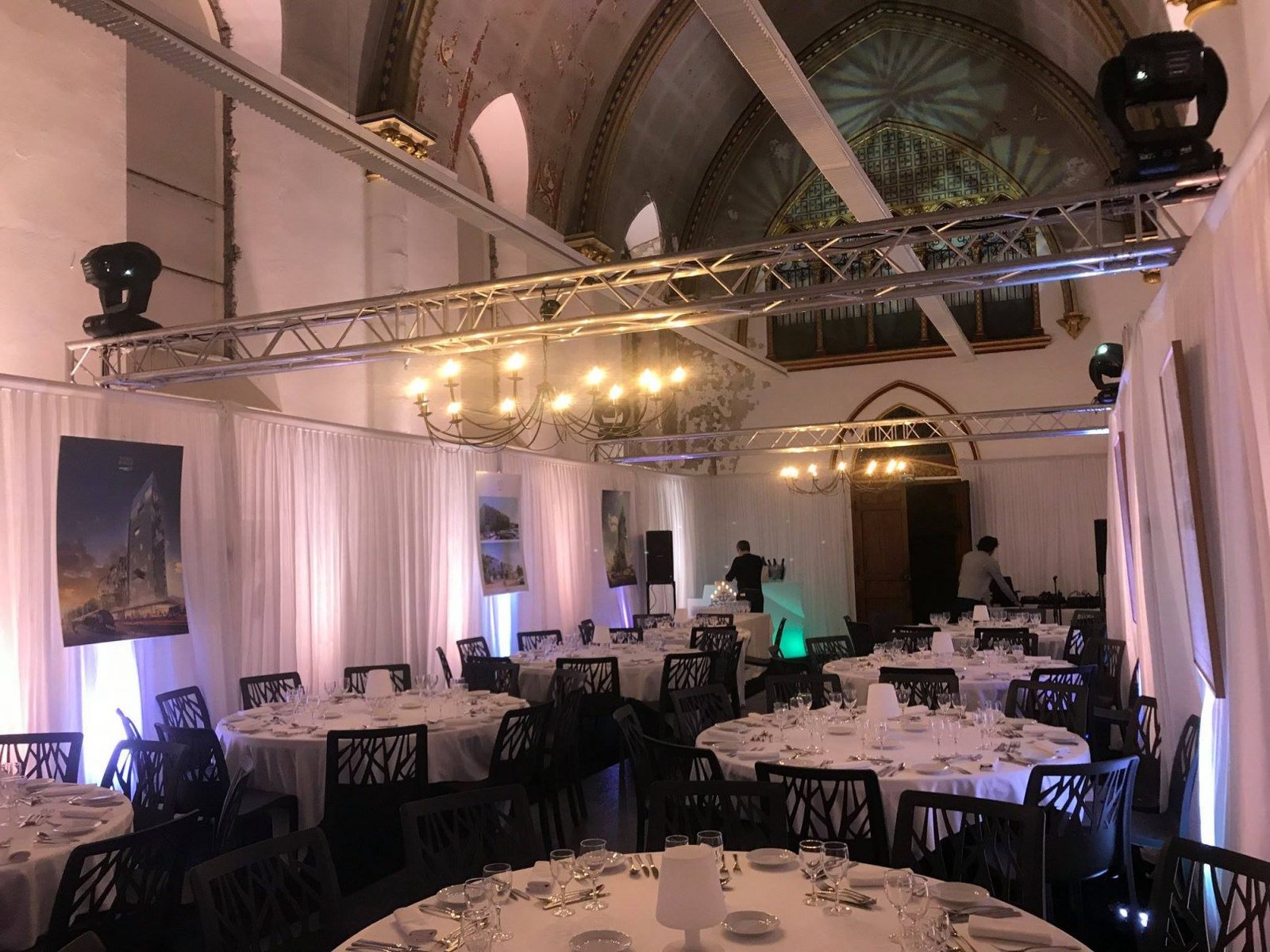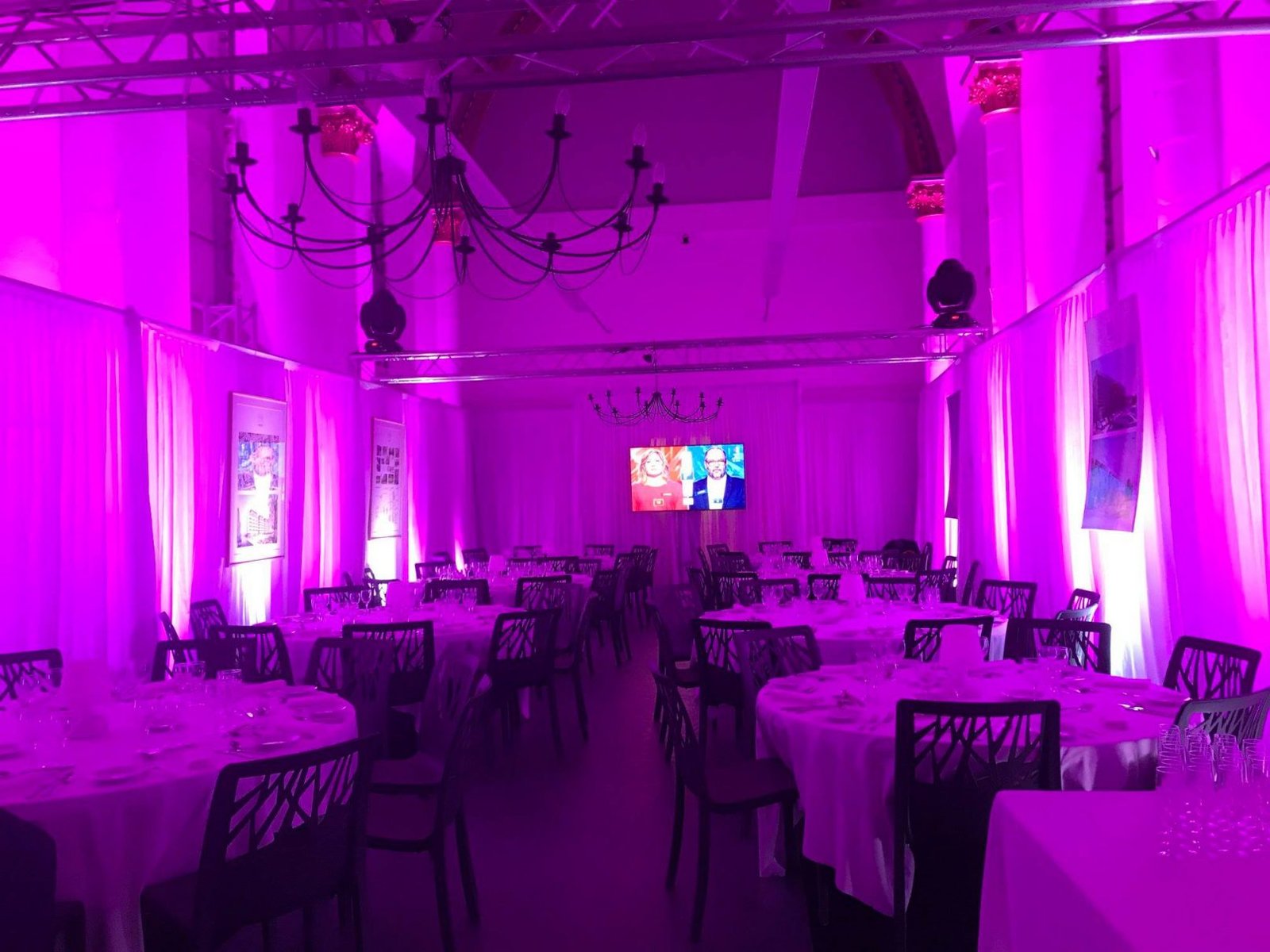 Transformation d’une ancienne chapelle en un lieu élégant et décoré : mise en lumière, ambiancement et vidéo. Prestation dans le cadre d’un repas d’affaires d’un constructeur immobilier.