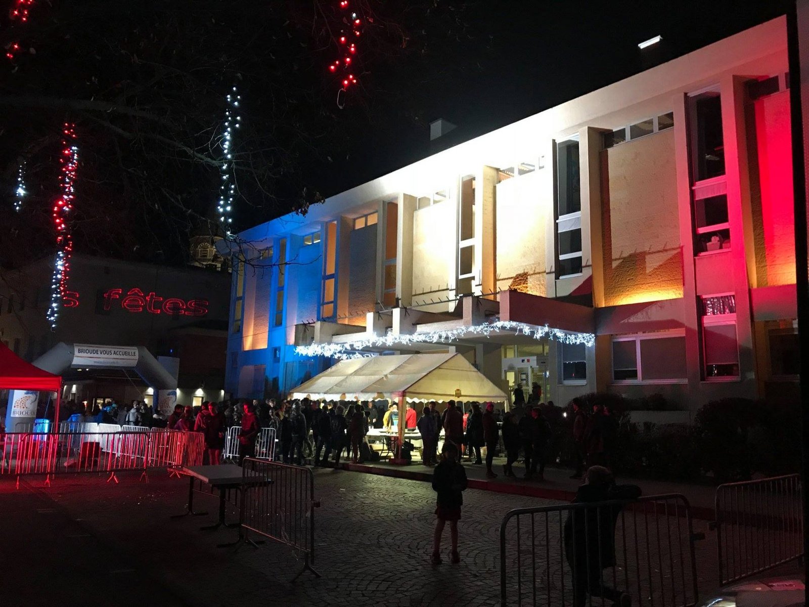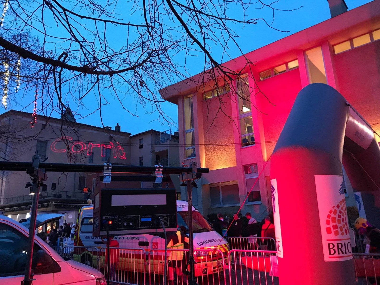 Éclairage urbain décoratif, LASER et effets spéciaux, shooter, flammes, pour la Corrida de St Sylvestre à Brioude.